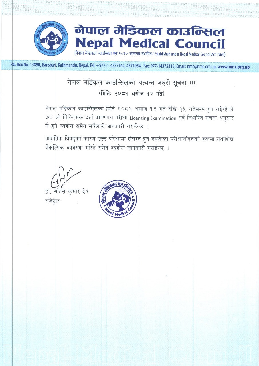 नेपाल मेडिकल काउन्सिलको मिति २०८१ असोज १३ गते देखि १५ गतेसम्म हुन गईरहेको ७० औ चिकित्सक दर्ता प्रमाणपत्र परीक्षा Licensing Examination पूर्व निर्धारित सूचना अनुसार नै हुने, साथै